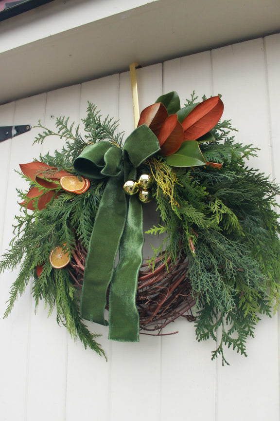 Natural, elegant, and full of winter charm, our Evergreen Magnolia Grapevine wreath is designed on a 14" grapevine base with fresh seasonal greens, magnolia leaves, dried orange slices, and soft holiday accents. Smaller in scale but rich in detail, this wreath brings a warm, nostalgic touch to your front door all season long.