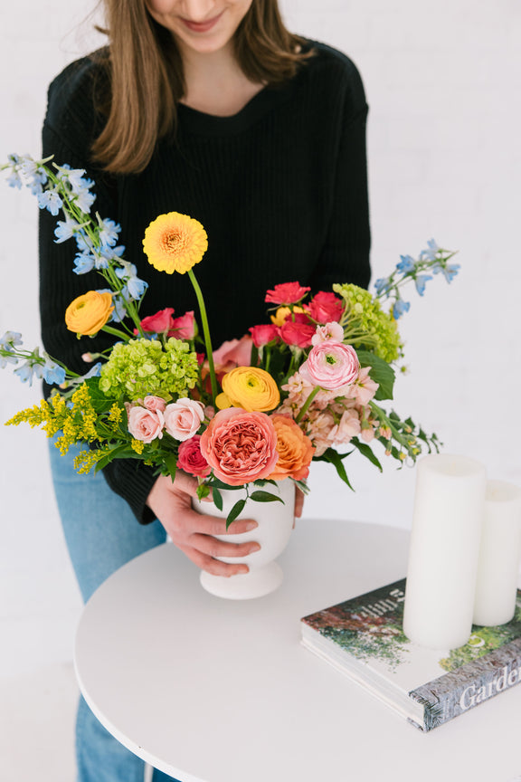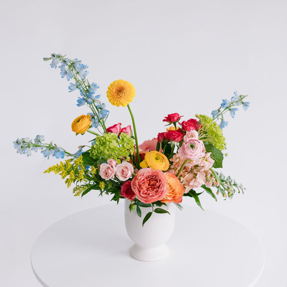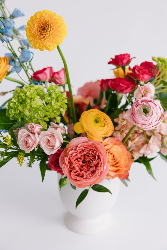 Our Garden Ceramic Arrangement is a flower-forward blend of seasonal blooms complemented by fresh greenery. Designed in a luxurious white ceramic glazed vessel, it’s perfect for those who love a lush, freshly picked feel.